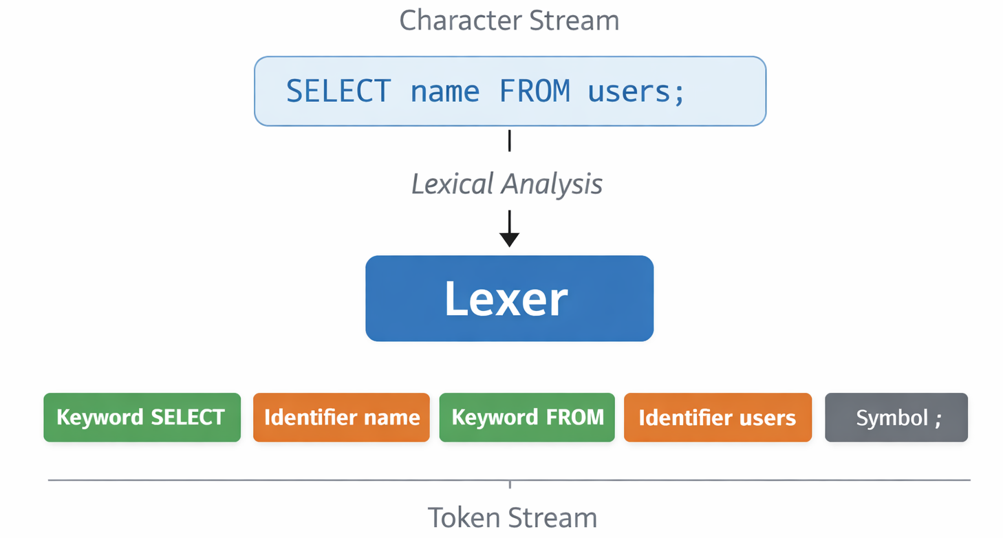 Lexical analysis is about creating order from a chaotic string of characters. By transforming raw input into a structured stream of tokens, we provide the clean interface required for the next stage of query processing.